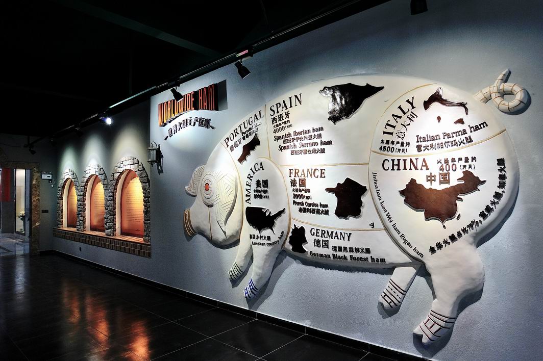 在世界火腿博覽館里,講述了火腿從絲綢之路一路傳播到世界各地,從中國一路出發(fā)到意大利、西班牙、法德英美等各國,隨著歷史變遷,在自然、人文、地理和氣候綜合因素下成就了世界各地各自不同的經(jīng)典火腿文化,并通過歐洲火腿商鋪、窖藏庫、原料豬生長等場景復(fù)原形式讓人真切感受了世界各國的火腿文化魅力。