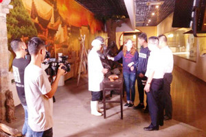 在《常中丞筆記》中,火腿叫做蘭熏,《東陽縣志》稱熏蹄,《本草求原》稱南腿,由此可觀,火腿此物名聲深遠(yuǎn),頗受眾人喜愛,不然也不會(huì)有如此多的“小名”。 10月17日這天,浙江經(jīng)視旅游節(jié)目《48小時(shí)》攝制組團(tuán)隊(duì)在中國火腿博覽館、世界火腿博覽館開始了“火腿”的探索之旅,從起源伊始談至繁華盛宴,期間故事種種萬千。 從中國火腿博覽館入口處的“百姓勞軍圖”便開始了這場(chǎng)對(duì)話。而在博覽館內(nèi)的火腿制作流程雕塑則完全將攝制組吸引,無論是考驗(yàn)刀工的制作火腿頭道工序——修胚,還是考驗(yàn)“鹽功”的——上鹽環(huán)節(jié),都深